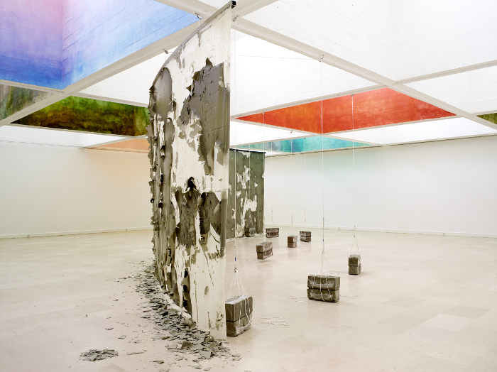 Vues de l’exposition « dérobées » / Flora Moscovici & Linda Sanchez. Flora Moscovici, Sept notes, 2019. Pigments acrylique liant vinylique. Production Villa Arson Nice / Linda Sanchez, La détente II, 2015-2019. Argile bâche cordes poulies, durée et dimensions variables. Production Villa Arson Nice. Courtoisie Galerie Papillon, Paris.